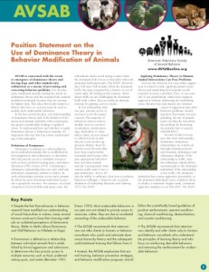 This statement has been developed for the purpose of clarifying how AVSAB views the theory of dominance relationships between animals. We also hope that it helps to dispel some myths that have recently become more prevalent among some who work in this field.